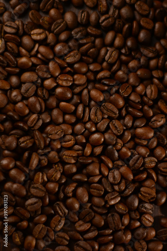 © Cupido, Fototapeta premium Roasted coffee beans on a wooden table