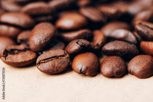 © Viktoriya, Naklejka premium Roasted coffee beans on beige background. Closeup, copy space