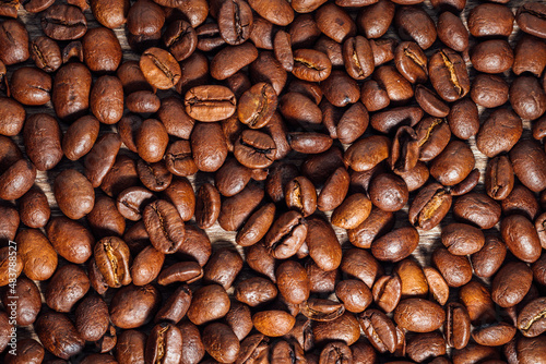 © JakoubekJak, Naklejka premium Roasted coffee beans on dark brown wooden table. Top view on coffee beans on wooden background.