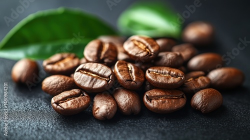 © RONNY, Naklejka premium Roasted coffee beans on dark surface with green leaves
