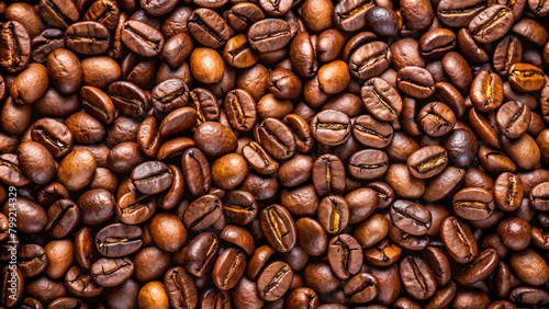 Obraz premium Roasted coffee beans on full frame background. Close-up