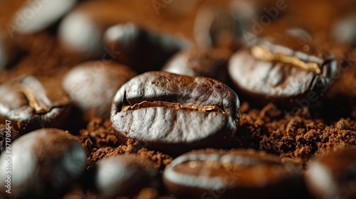 © FryArt, Obraz premium Roasted coffee beans on ground coffee