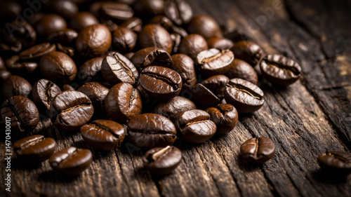 © @foxfotoco, Naklejka premium Roasted Coffee Beans on Rustic Wooden Background in Warm Lighting