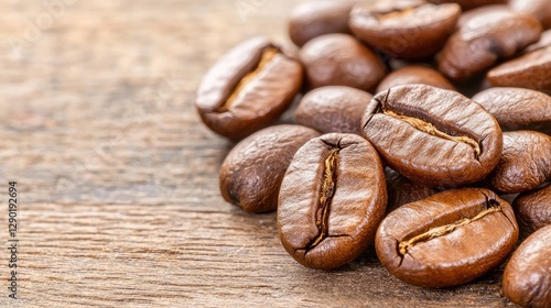 © KIMEHIME, Naklejka premium Roasted coffee beans on wooden surface, close-up view, rustic background, food and drink photography