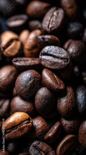 Naklejka premium roasted coffee beans pile with rich brown texture, close-up of aromatic coffee beans with soft, directional lighting, concept of coffee shops, cafes, food industry