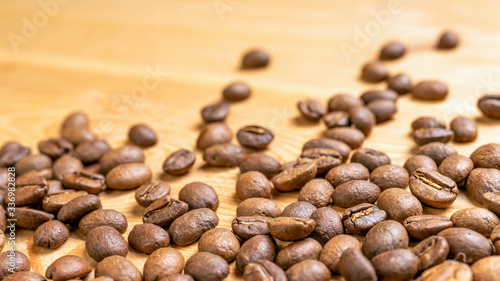 Fototapeta premium Roasted coffee beans randomly dumped on a wooden table-Close up