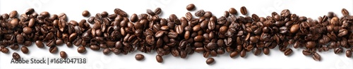 © dunhil, Naklejka premium Roasted coffee beans scattered in a horizontal line on a white background
