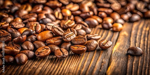 © Kukar Studio, Naklejka premium Roasted coffee beans scattered on a rustic wooden surface, showcasing their rich brown hues and intricate details.