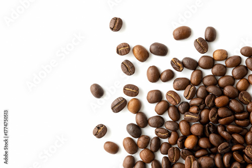 © Mehar, Naklejka premium Roasted coffee beans scattered on a white surface ready for grinding and brewing