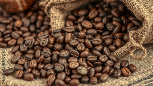 Fototapeta premium Roasted coffee beans spilling from a burlap sack onto a burlap surface