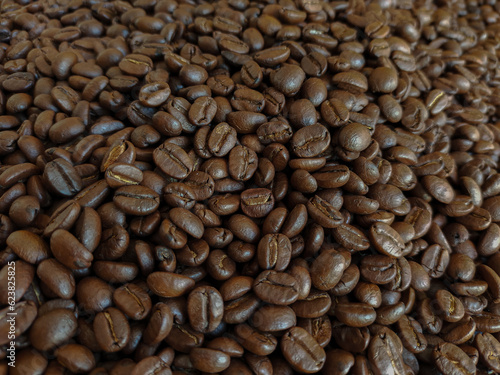 © Weerajit James, Fototapeta premium Roasted coffee beans stacked abstract background Aromatic bitter coffee that is popular to eat in the morning to feel refreshed. cure drowsiness.
