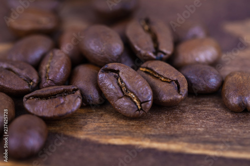 Naklejka premium Roasted coffee beens on a wooden table, close up