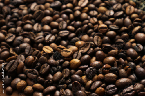 © Mynameislisenok, Fototapeta premium Roasted coffee grains as background, close up