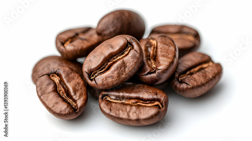 © Santri, Fototapeta premium Roasted Dark Brown Coffee Beans Close-Up on White Background