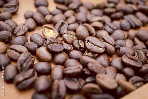 Naklejka premium Roasted dark brown coffee beans on top of the wooden table, closeup coffee...