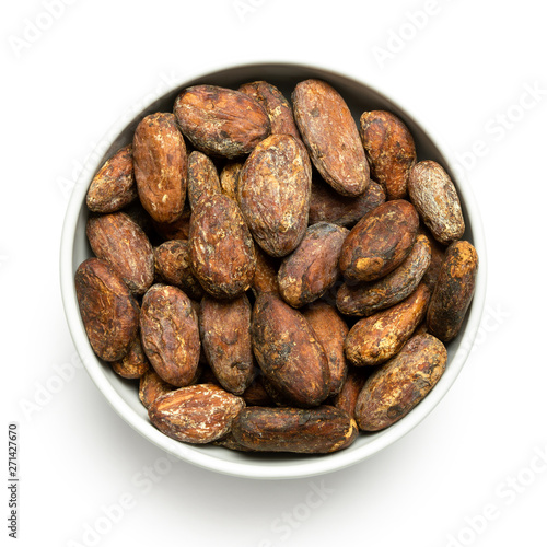 Obraz premium Roasted unpeeled cocoa beans in a white ceramic bowl isolated on white from above.