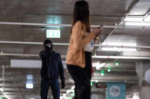Fototapeta premium Robber lonely woman In the dark and dangerous.The robber threatened her. The...