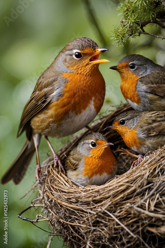 © Sheharyar, Fototapeta premium robin feeding thier chicks in nest