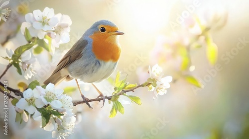 Fototapeta premium Robin perched on blossoming apple tree branch, spring morning light