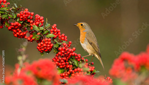 © Vety, Fototapeta premium Robin perched on branch with vibrant red berries in natural setting