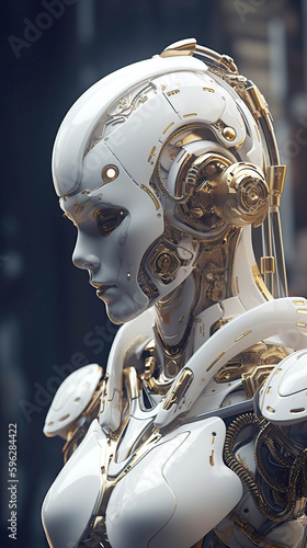 © innluga, Fototapeta premium Robot android woman with golden details. Generative Ai