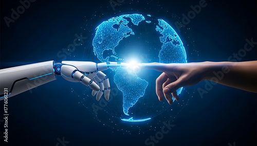 © Vector Market, Fototapeta premium Robot Arm Touching World with Human Hand Concept of Future Technology Artificial Intelligence Interaction Digitization