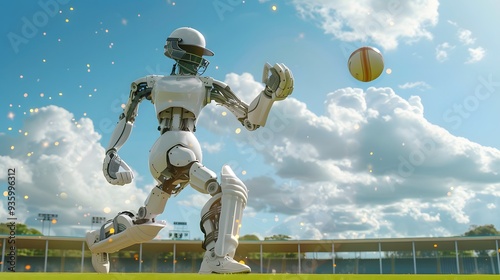 © sarana, Naklejka premium Robot Cricketer Hitting Ball: A robot cricketer executing a perfect stroke, sending the ball flying across the field.