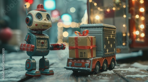 Fototapeta premium Robot Delivering Tiny Gift Box in Winter Scene