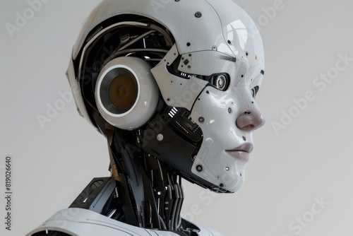 © Loktor, Fototapeta premium Robot futurista blanco con luces led. Asistente robotico de laboratorio. Inteligencia artificial con aspecto humanoide. Cyborg