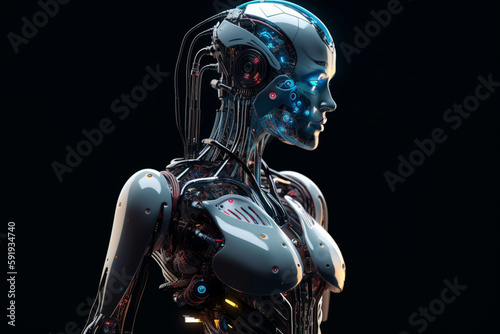 © Art Gallery, Naklejka premium Robot girl isolated on black background. The concept of artificial intelligence, technology. Cyborg woman. Female android. Copy space. Scientific progress. ai generated