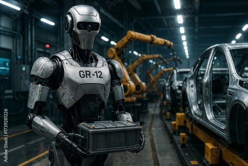 Fototapeta premium Robot GR-12 working in an advanced automotive manufacturing facility with...