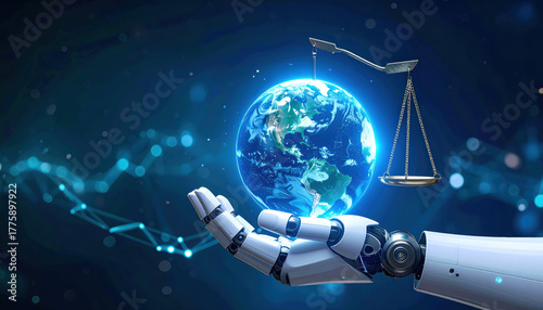 Fototapeta premium Robot hand holding globe with justice scale represents future of ethical ai...