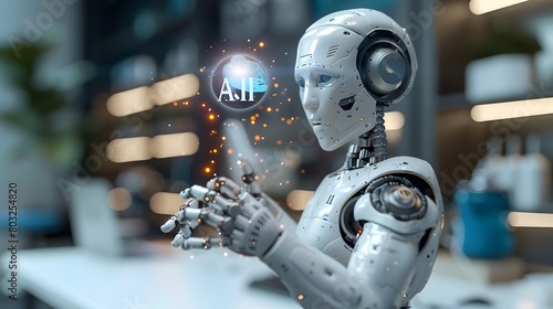 Fototapeta premium Robot Hand Holding Icon on Light Blue Background with Minimalistic Design in Professional