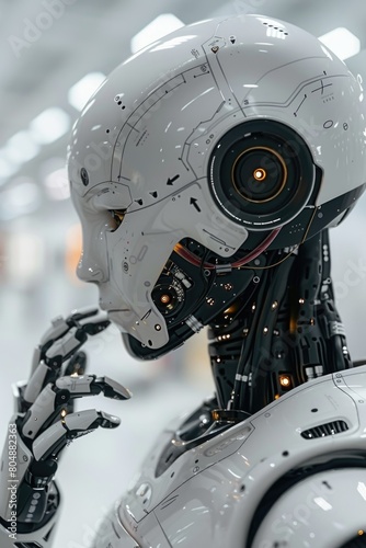© Boomanoid, Fototapeta premium Robot holding hand up to face