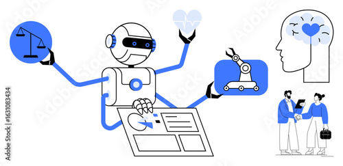 Fototapeta premium Robot multitasking with scales, heart, documents, and machinery, showcasing AI ethics, automation, and collaboration. Ideal for innovation, technology robotics decision-making human-AI