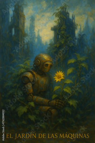 © Daniel Rabadán, Fototapeta premium Robot observing a sunflower in natural forest environment