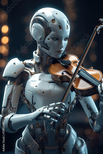 © Roman, Fototapeta premium Robot playing violin. Ai with a musical instrument. Futuristic concept technology generative ai.