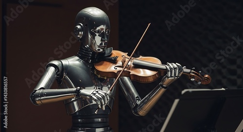 © anomalicreatype, Naklejka premium Robot Playing Violin with Sheet Music Stands Showing Ai Artistry