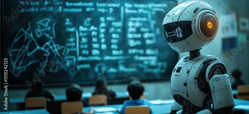 © Vergiliy, Fototapeta premium Robot teacher in classroom explaining complex concepts to students with chalkboard
