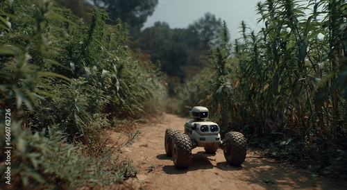Fototapeta premium Robot Vehicle Moving in Crop Field: Shows agritech application, ideal for...