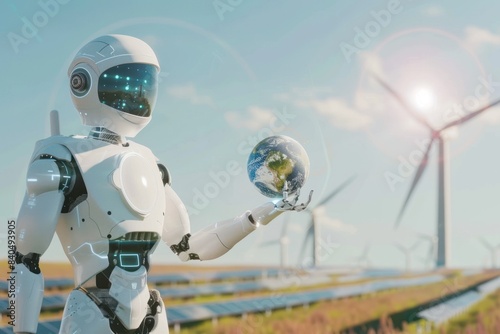 © Oksana, Naklejka premium Robot with a digital globe and wind turbines