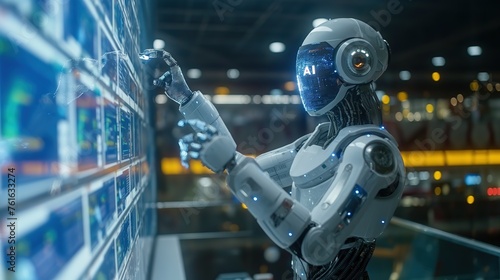 Fototapeta premium robot with Ai word touching hologram screen, with bokeh light glow, Ai...