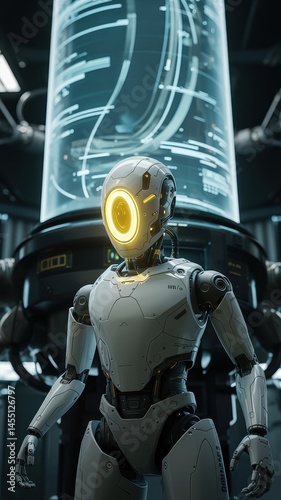 © Nemanja, Fototapeta premium Robot with single yellow eye and circuitry in dark futuristic setting
