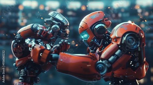 © sarana, Fototapeta premium Robot Wrestler Grappling Opponent: A powerful robot wrestler in the midst of grappling its opponent.