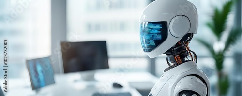 Fototapeta premium Robotic AI assistant, high-tech office, holographic display