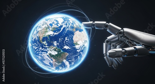 © Umer, Fototapeta premium Robotic arm interacts with a glowing Earth globe representing global connectivity and technological advancement