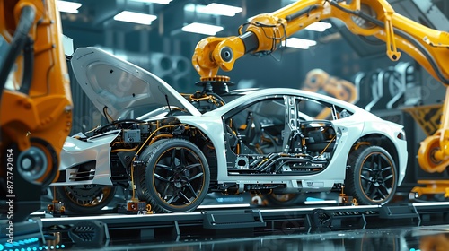 Fototapeta premium Robotic Arms Assembling Electric Car in Modern Automated Factory with Cutting-Edge Technology and Innovation