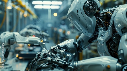 Fototapeta premium Robotic arms assembling parts in an advanced manufacturing facility.