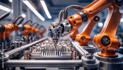 © LIGHTFIELD STUDIOS, Fototapeta premium Robotic arms craft intricate parts precisely in a vibrant, futuristic factory.