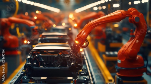 Fototapeta premium Robotic arms in an automotive assembly line, highlighting industrial...